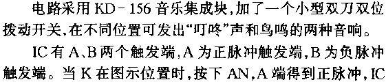 模擬聲音樂門鈴是采用專用的模擬聲音樂IC,它與普通音樂IC一樣,也是典型的CMOS電路.它內(nèi)存若干個音符,當(dāng)門鈴受