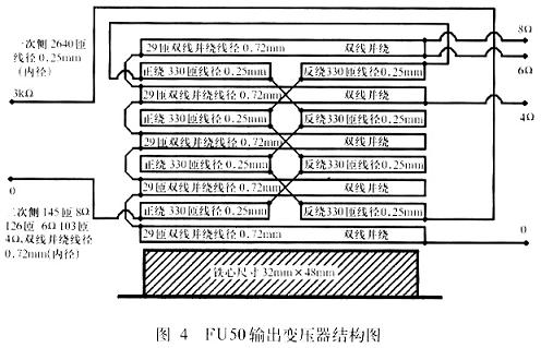 ????輸出變壓器是Q2的負(fù)載,其品質(zhì)的好壞很大程度上決定整機的性能,變壓器的具體制作圖如圖4所示。本功率管的工作屏流較高,約有40W的功耗,如果按照其他方式的接法,有可能已經(jīng)到達最極限的屏耗了,但由于本機采用的是三極管的接法,G2上約有4mA的電流流過,實際陽極上的電壓為86mA,陽極與陰極的壓降約為425V,實際陽極的屏耗約為36W,低于最大屏耗40W.因此從以上的數(shù)據(jù)和實踐來看是完全成立的,并且實際試聽的效果也是非常不錯的,再加上功率管的價格比較便宜,因此制作中讀者完全沒有必要擔(dān)心由于功率管功耗過大而減短壽命。