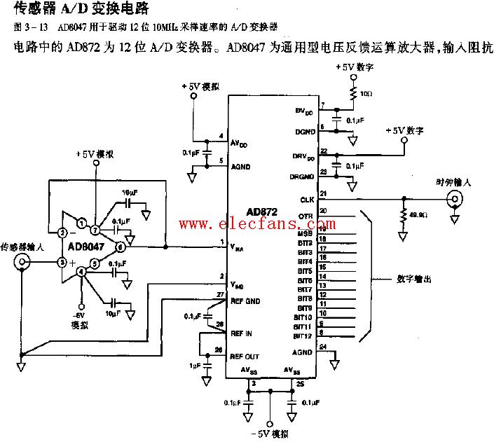 AD8047用于驅(qū)動(dòng)12位10MHz采樣速率的AD變換器電路