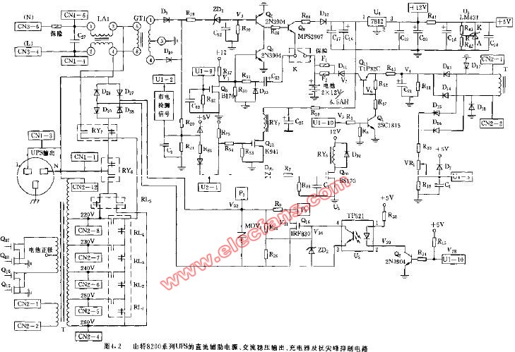 santak UPS-500的交流穩(wěn)壓控制及輔助電源供電系統(tǒng)電路