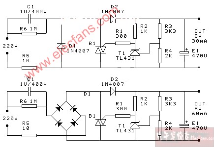 電路的原理分析:電容C1的容量如果增大一倍,輸出電流可以增加近一倍,但不能太大. 輸出紋波較大,可以在后邊再接7805/317等模擬穩(wěn)壓器. 改變R3的值,可以改變輸出電壓. 所標(biāo)輸出電流為最大輸出電流. 雙向可控硅B1為采用1A的即可. 該電源可以短路. 如果能保證電容C1接在火線上,可以用手摸,本來這個電源是給人不接觸的小電器提供的,只要無極性電容C1耐壓夠,長期使用沒問題,從原理上講,這是一個輸入電壓為220V的并聯(lián)穩(wěn)壓電路,電壓降在C1上,如果輸出電流要大,可以增大C1的容量,我曾經(jīng)增大到2UF,可以正常使用.也試驗過4UF,在拔插插頭時,火花太大,就沒再使用. 我用的是圖1,可控硅和431都沒損壞,實際上由于E1是C1的470倍,即使在接通的瞬間是交流的峰值300多伏,在E1上也不會有高壓. 功率很好計算,1UF的電容,對50HZ的容抗是3.15k,輸出電流估算:200V/3000歐姆,電流約60MA,如果半波整流,電流只有一半.約30MA .分析的非常詳細(xì)。