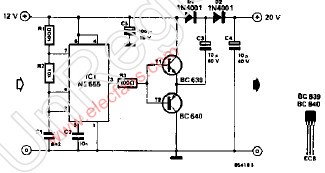 利用一個(gè)555定時(shí)器和倍壓器,該電路可提供20,大于等于50MA的電壓,T1和T2用作驅(qū)動(dòng)倍壓器的功率放大器,工作頻率約為8.5Hz。