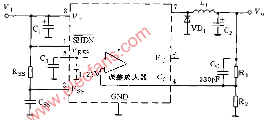 采用MAX761構(gòu)成的輸出電壓可調(diào)電路