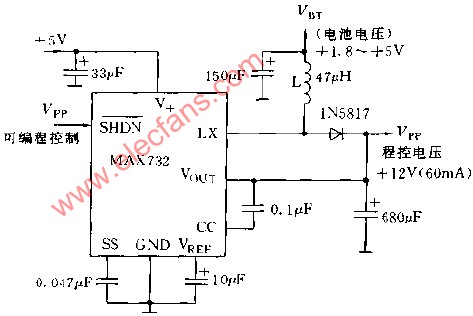 MAX732電池供電+12V快速存儲器編程電源電路