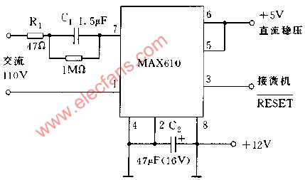 MAX608構(gòu)成固定5V輸出的應(yīng)用電路,MAX608 5V POWER SUPPLY
