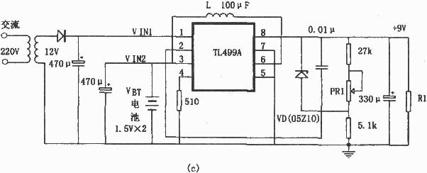 圖(c)所示為采用TL499A構(gòu)成的電池后備電源電路。若輸入端VIN1(1腳)加直流電壓,就可獲得9V輸出電壓。它工作于線性穩(wěn)壓器狀態(tài),噪聲非常小,但前提是輸入電壓VIN1應比輸出電壓VOUT高出1V。在圖(b)所示電路中,TL499A 1腳的輸入電壓VIN1可由交流220V通過變壓整流來提供,作為本電源電路的主要供電電壓。若VIN1為10V以上,就工作于線性穩(wěn)壓器狀態(tài);若輸入電壓VIN1低于l0V,就工作于開關(guān)穩(wěn)壓器狀態(tài),此時由電池通過TL499A③腳供電,經(jīng)升壓變換后輸出。停電時電池作為后備電源,這樣可方便構(gòu)成不間斷電源。線性穩(wěn)壓器與開關(guān)穩(wěn)壓器之間的轉(zhuǎn)換在TL499A的內(nèi)部自動進行,雖然輸出電壓有些變動,但只有2%左右,一般用途不受影響。輸入電壓VIN1最高為32V。