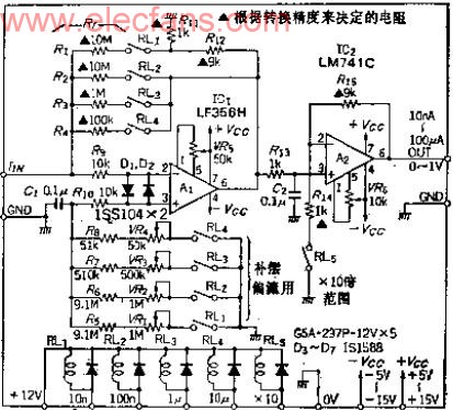 這是一種以硅光二極管SPD為代表的前置放大器,可用作微電流傳感器的放大。用接點式繼電器進行量程切換,可覆蓋1NS~10UA的范圍。繼電器的另一接點用來改變輸入偏流IS引起的失調(diào),根據(jù)對應量程切換偏置電阻。響應頻率隨反饋電阻R1~R4而變,輸入為直流電流。