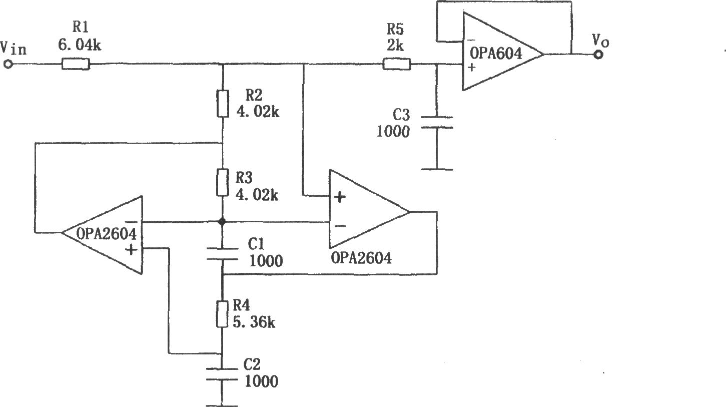 如圖所示為三階低通濾波電路。該電路為利用一片JFET輸入的高保真運(yùn)算放大器OPA604和一片特性與OPA604相同的雙運(yùn)放OPA2604組成的三階巴特沃斯低通濾波器。按圖示參數(shù),其-3dB截止頻率為40kHz。