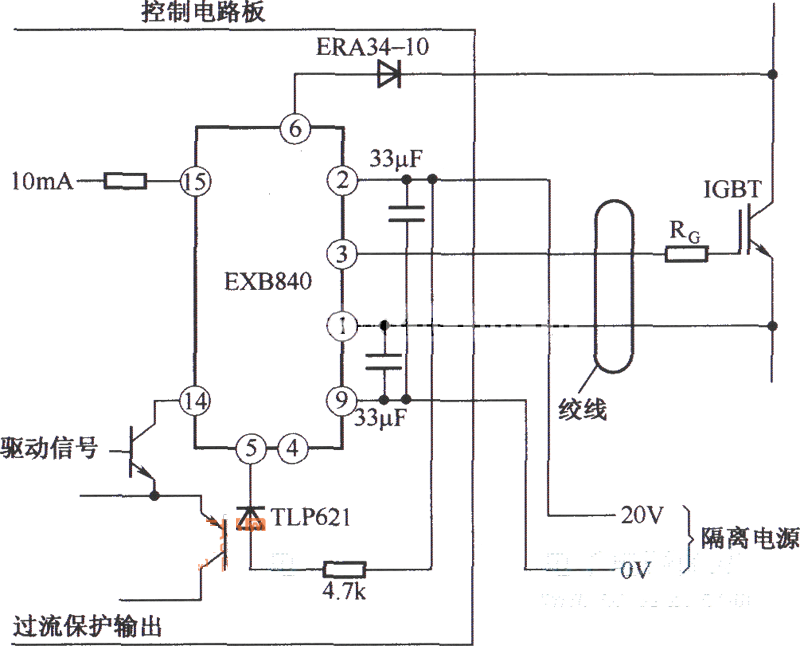 4 EXB840是為驅(qū)動150A,600V一下的IGBT而設(shè)計的混合集成電路,并且內(nèi)裝光耦合電路,具有過流檢測及切斷電路的功能。