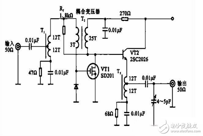 電路中,輸入信號(hào)經(jīng)耦合電容器加到變壓器Ti繞組的中心抽頭,再經(jīng)變壓器T2的初級(jí)繞組加到場(chǎng)效應(yīng)晶體管的柵極上,這種方式具有阻抗轉(zhuǎn)換的功能,將50 n輸入阻抗提高到200 n,變壓器Tz的次級(jí)繞組又是VT1的滿極負(fù)載,放大器的增益取決于T2的次級(jí)繞組(25/3=8,33)。VT2是射極輸出放大器方式,通過線圈抽頭的選擇可得到5011的輸出阻抗。