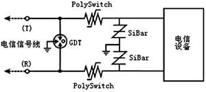 圖7 采用GDT、PolySwitch和SiBar的電信設(shè)備三重協(xié)同保護電路工作原理圖