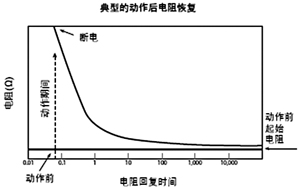 圖5表示PPTC元件過電流/過溫度后,當過電流/過溫度故障消除后,PPTC元件阻值的恢復(fù)曲線??梢娂词谷舾尚r后,PPTC元件的阻值仍然大于初始阻值,電阻的減降將需持續(xù)一段較長的時間,最終電阻才會接近初始電阻,這個時間可能是幾天、幾個月或更久。但是,在實際應(yīng)用中,要使PPTC元件的阻值恢復(fù)到初始值是不現(xiàn)實的。所以在選用PPTC元件時,在決定PPTC的保持電流時就應(yīng)考慮PPTC元件動作后并恢復(fù)1小時后的初始電阻RImax這個參數(shù)。