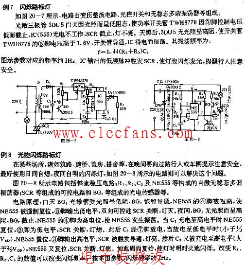光控閃爍路標(biāo)燈電路圖:電路由變壓整流電路,光控開關(guān)和無穩(wěn)態(tài)多諧振蕩器等組成。
