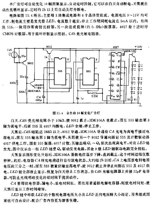 白天控制廣告燈熄滅,晚上光線暗時(shí)則自動(dòng)開啟l~7小時(shí)(可調(diào))后自動(dòng)熄滅。該廣告燈既可及時(shí)照明,又能節(jié)約用電。本控制器靈敏度高,不受天氣季節(jié)影響,還可用于彩燈、路燈等的控制。