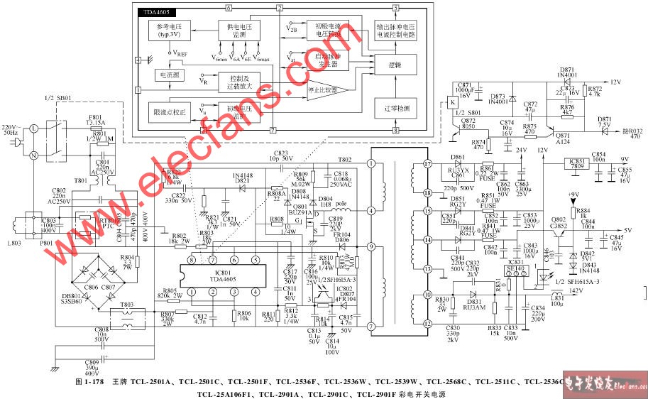 王牌TCL-2518E、TCL-C2533E、TCL-3418E、TCL-251SEW、TCL-2918E、TCL-2918EW、TCL-2977E、TCL-2513EW、TCL-2913E、TCL-2913EW、TCL-2906E彩電開關(guān)電源電路