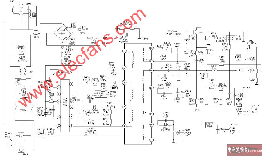 王牌TCL-2518E、TCL-C2533E、TCL-3418E、TCL-251SEW、TCL-2918E、TCL-2918EW、TCL-2977E、TCL-2513EW、TCL-2913E、TCL-2913EW、TCL-2906E彩電開關(guān)電源電路
