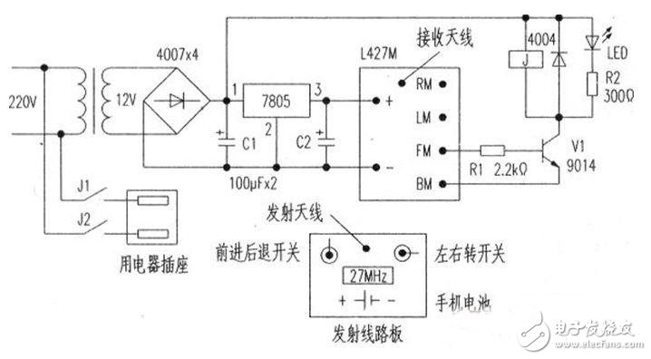 工作原理:市電AC220V通過變壓器降壓為AC12V,整流濾波,一路CD12V繼電器待用,一路經(jīng)過7805三端穩(wěn)壓器,輸出+5V電壓作接收器的 工作電壓。當(dāng)發(fā)射器打開原玩具汽車前進擋開關(guān),發(fā)射器的天線上發(fā)射出27MHz信號,接收器通過天線接收到信號,在FM、BM兩端產(chǎn)生+5V電壓.通過 Rl電阻使三極管V1導(dǎo)通,此時繼電器T吸合,常開點J1、J2閉合,用電器插座有電開始工作,同時信號燈LED亮。