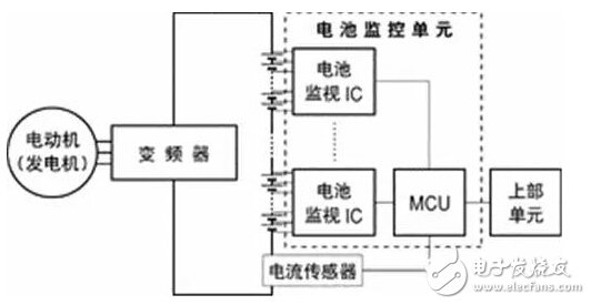 由數(shù)十個(gè)至上百個(gè)電池單元串聯(lián)形成電池組,對(duì)其負(fù)荷——變頻器和電動(dòng)機(jī)供電。因串聯(lián)電池組的電壓高達(dá)數(shù)十至數(shù)百伏,所以無(wú)法使用單獨(dú)的電池監(jiān)視系統(tǒng)對(duì)所有的電池單元進(jìn)行監(jiān)控。因此,一般每個(gè)電池監(jiān)視系統(tǒng)(IC)同時(shí)監(jiān)視8-16個(gè)電池單元。電池監(jiān)視IC主要監(jiān)視個(gè)電池單元的電壓、溫度和電池單元平衡等。
