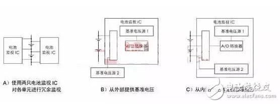 其中,A)電路為使用兩組IC對(duì)同一組電池組進(jìn)行冗余監(jiān)視;B)為從外部提供一個(gè)標(biāo)準(zhǔn)電壓源2用于確認(rèn)IC的測(cè)定精度。C)為從內(nèi)部產(chǎn)生該標(biāo)準(zhǔn)電壓源。