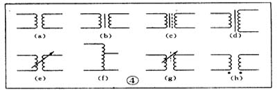 電感線(xiàn)圈在電路圖中的圖形符號(hào)見(jiàn)圖3。其中(a)是電感線(xiàn)圈的一般符號(hào),(b)是帶磁芯或鐵芯的線(xiàn)圈,(c)是鐵芯有間隙的線(xiàn)圈,(d)是帶可調(diào)磁芯的可調(diào)電感,(e)是有多個(gè)抽頭的電感線(xiàn)圈。電感線(xiàn)圈的文字符號(hào)是“L”。變壓器的圖形符號(hào)見(jiàn)圖4。其中(a)是空芯變壓器,(b)是磁芯或鐵芯變壓器,(c)是繞組間有屏蔽層的鐵芯變壓器,(d)是次級(jí)有中心抽頭的變壓器,(e)是耦合可變的變壓器,(f)是自耦變壓器,(g)是帶可調(diào)磁芯的變壓器,(h)中的小圓點(diǎn)是變壓器極性的標(biāo)記。