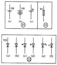 電池及熔斷器符號(hào)電池的圖形符號(hào)見(jiàn)圖10。長(zhǎng)線(xiàn)表示正極,短線(xiàn)表示負(fù)極,有時(shí)為了強(qiáng)調(diào)可以把短線(xiàn)畫(huà)得粗一些。圖10(b)是表示一個(gè)電池組。有時(shí)也可以把電池組簡(jiǎn)化地畫(huà)成一個(gè)電池,但要在旁邊注上電壓或電池的數(shù)量。圖10(c)是光電池的圖形符號(hào)。電池的文字符號(hào)為“GB”。熔斷器的圖形符號(hào)見(jiàn)圖11,它的文字符號(hào)是“FU”。