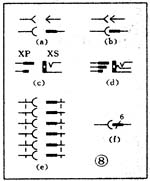 開(kāi)關(guān)在電路圖中的圖形符號(hào)見(jiàn)圖7。其中(a)表示一般手動(dòng)開(kāi)關(guān):(b)表示按鈕開(kāi)關(guān),帶一個(gè)動(dòng)斷觸點(diǎn),(c)表示推拉式開(kāi)關(guān),帶一組轉(zhuǎn)換觸點(diǎn):圖中把扳鍵畫(huà)在觸點(diǎn)下方表示推拉的動(dòng)作,(d)表示旋轉(zhuǎn)式開(kāi)關(guān),帶3極同時(shí)動(dòng)合的觸點(diǎn);(e)表示推拉式lX6波段開(kāi)關(guān);(f)表示旋轉(zhuǎn)式lX6波段開(kāi)關(guān)的符號(hào)。開(kāi)關(guān)的文字符號(hào)用“S”,對(duì)控,制開(kāi)關(guān)、波段開(kāi)關(guān)可以用“SA,對(duì)按鈕式開(kāi)關(guān)可以用“SB";