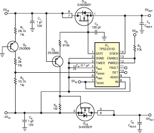 有些應(yīng)用場合需要使用一個(gè)熱插拔控制器、一個(gè)斷路器或者兩者都要使用,以適應(yīng)雙極性直流輸入電源干線。在某些使用熱插拔控制器的情況下,這種要求僅僅出于對起動(dòng)電流的考慮。要消除連接器的應(yīng)力和電源干線的干擾,就必須控制起動(dòng)電流。另外一些應(yīng)用場合在某一電源因某種原因發(fā)生故障時(shí)就會(huì)出現(xiàn)問題。砷化鎵FET放大器的偏置電源就是一個(gè)范例。如果你去掉負(fù)的柵極偏壓,那你也得去除正的漏極電源;否則,放大器就會(huì)因漏極電流過大而自行毀壞。但你只要使用一個(gè)單通道熱插控制器,就可滿足上述這兩個(gè)要求。