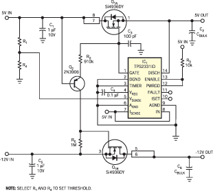 當(dāng)正負(fù)兩個(gè)電壓都超出各自的閾值時(shí),IC1接通,為兩只FET提供的受控制的轉(zhuǎn)換速率隨時(shí)間線性增長。要注意的是,該電路只使用N溝道FET,因?yàn)槌叽绾唾M(fèi)用給定的情況下,N溝道FET的導(dǎo)通電阻比P溝道FET的要小。