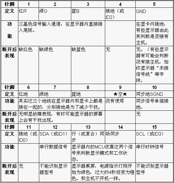 目前顯示器接口都采用上述的標(biāo)準(zhǔn),一般缺9號(hào)針,有的4#,11#也沒(méi)有。有的客戶在因?yàn)橹鳈C(jī)出現(xiàn)問(wèn)題后,顯示器不亮?xí)r,主動(dòng)檢查故障的原因,當(dāng)看到顯示器的15針D形插頭缺了一根針后,因?yàn)椴涣私怙@示器接口每根針的定義,就誤認(rèn)為是因?yàn)槿绷?#針顯示器才不亮的,就自己找了一根大頭針或家里的縫衣針,截?cái)嗪蟛迦?#針的缺孔。在一般情況下不會(huì)造成其他故障,但有可能在用戶自己動(dòng)手操作時(shí)把其他針折斷,造成數(shù)據(jù)線報(bào)廢。要知道,一根顯示器數(shù)據(jù)線要不少錢呢。