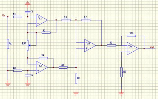 此信號放大電路有運放A1、A2組成第一級差分式電路。A3組成第二級差分式電路,RW、R3、R4、R7 組成反饋網(wǎng)絡(luò),引入深度電壓串聯(lián)負(fù)反饋,故有較高的輸入阻抗,且A1、A2都選用同相端作為輸入端,則它們的共模輸出電壓和漂移電壓也都相等,再經(jīng)過A3 組成的差分電路,可以相互抵消。故具有很強(qiáng)的共模抑制功能和較小的輸出漂移電壓。A4是電壓反向跟隨器,其作用是使前后級隔離。