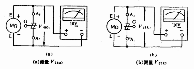 使用萬用表判定門極G的方法與硅單向開關(guān)相同,不再贅述。另外由于A1、A2極在結(jié)構(gòu)上完全對稱,可不再區(qū)分,允許互換使用。檢查正、反向轉(zhuǎn)折電壓對稱性的電路見圖3。仍由兆歐表和萬用表相配合,分別測出V(BO)、V(BR),最后比較二者之差。