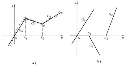 圖11-4-2a虛線(xiàn)所示的電阻特性曲線(xiàn)可由三段直線(xiàn)Oa、ab、bc近似表示,這三段直線(xiàn)又可用圖11-4-2b中的一個(gè)線(xiàn)性電阻G0和兩個(gè)凹形電阻