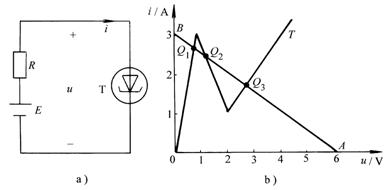 回憶圖11-2-2a電路,如二極管VD是理想的,總伏安特性如圖11-2-2d所示。將曲線(xiàn)的u、i軸互換,特性如圖11-4-1a所示,稱(chēng)為凹形電阻特性,用圖11-4-1b表示其符號(hào)(圖11-2-4c的特性是凸形電阻特性)。