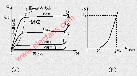 如圖2(a)所示,當(dāng)vGS>VT且為一確定值時(shí),漏-源電壓vDS對(duì)導(dǎo)電溝道及電流iD的影響與結(jié)型場(chǎng)效應(yīng)管相似。漏極電流iD沿溝道產(chǎn)生的電壓降使溝道內(nèi)各點(diǎn)與柵極間的電壓不再相等,靠近源極一端的電壓最大,這里溝道最厚,而漏極一端電壓最小,其值為vGD=vGS - vDS,因而這里溝道最薄。但當(dāng)vDS較?。╲DS 隨著vDS的增大,靠近漏極的溝道越來(lái)越薄,當(dāng)vDS增加到使vGD=vGS-vDS=VT(或vDS=vGS-VT)時(shí),溝道在漏極一端出現(xiàn)預(yù)夾斷,如圖2(b)所示。再繼續(xù)增大vDS,夾斷點(diǎn)將向源極方向移動(dòng),如圖2(c)所示。由于vDS的增加部分幾乎全部降落在夾斷區(qū),故iD幾乎不隨vDS增大而增加,管子進(jìn)入飽和區(qū),iD幾乎僅由vGS決定。 三、特性曲線、電流方程及參數(shù) 1.特性曲線和電流方程 N溝道增強(qiáng)型MOS管的輸出特性曲線如圖1(a)所示。與結(jié)型場(chǎng)效應(yīng)管一樣,其輸出特性曲線也可分為可變電阻區(qū)、飽和區(qū)、截止區(qū)和擊穿區(qū)幾部分。轉(zhuǎn)移特性曲線如圖1(b)所示,由于場(chǎng)效應(yīng)管作放大器件使用時(shí)是工作在飽和區(qū)(恒流區(qū)),此時(shí)iD幾乎不隨vDS而變化,即不同的vDS所對(duì)應(yīng)的轉(zhuǎn)移特性曲線幾乎是重合的,所以可用vDS大于某一數(shù)值(vDS>vGS-VT)后的一條轉(zhuǎn)移特性曲線代替飽和區(qū)的所有轉(zhuǎn)移特性曲線,與結(jié)型場(chǎng)效應(yīng)管相類似。在飽和區(qū)內(nèi),iD與vGS的近似關(guān)系式為 ???? 式中IDO是vGS=2VT時(shí)的漏極電流iD。 2. 參數(shù) MOS管的主要參數(shù)與結(jié)型場(chǎng)效應(yīng)管基本相同,只是增強(qiáng)型MOS管中不用夾斷電壓VP,而用開(kāi)啟電壓VT表征管子的特性。 4.3.2 N溝道耗盡型場(chǎng)效應(yīng)管 圖1 相關(guān)推薦