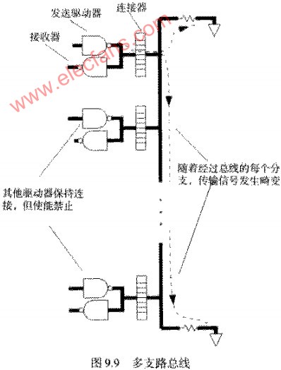 多支路情況下就有很大不同,在如圖9.9所示的多支路總線中,連接在總線上的發(fā)送器每次只有一個使能,而其他發(fā)送器則保持使能禁止,但其還是連接在總線上,直至辦輪到其發(fā)送,這種特殊類型的總線兩端都進行了端接,以防止反射,總線上傳播的信號的上升時間只是線路總長度的一小部分。
