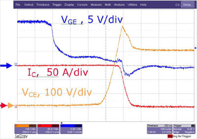短換流回路 圖4 顯示的是,在標(biāo)稱電流、400V直流母線電壓和25°C結(jié)溫條件下的短換流情況的開關(guān)波形。