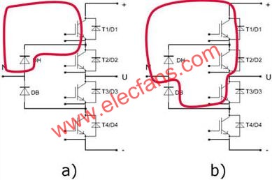 從圖1a可以看出,電壓和電流處于正方向,T1和DH組成了BUCK電路的工作方式,而T2則以常通的方式輸出電流。而電壓和電流處于負(fù)向期間,T4與DB 組成了BOOST電路的工作方式,T3以常通方式輸出電流。在上述兩種情況下,換流只有發(fā)生在兩個(gè)器件中,我們稱之為短續(xù)流。然而當(dāng)輸出電流為負(fù)向而電壓為正向的情況下,流過(guò)T3和DB的電流必須如圖1b)所示換相至D2和D1。這種換流涉及到四個(gè)器件,因此稱之為長(zhǎng)換流回路。在其它情況下,會(huì)存在另一個(gè)長(zhǎng)換流路徑。在設(shè)計(jì)三電平變換器時(shí),如何控制好長(zhǎng)換流回路的雜散電感和過(guò)壓?jiǎn)栴},是設(shè)計(jì)人員所要面臨的又一挑戰(zhàn)。