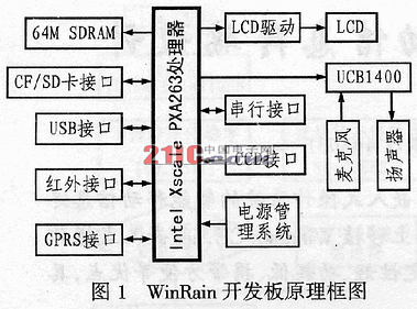 本智能移動(dòng)信息終端要求采用Microsoft Windows CE. Net嵌入式操作系統(tǒng),能夠通過(guò)CCD攝像頭實(shí)現(xiàn)圖像的輸入,通過(guò)觸摸屏實(shí)現(xiàn)輸入,同時(shí)也能夠通過(guò)GPRS模塊和另的終端以及主控設(shè)備實(shí)現(xiàn)遠(yuǎn)程數(shù)據(jù)傳輸和通信根據(jù)PXA263的特點(diǎn)和應(yīng)用要求,需要首先開(kāi)發(fā)一個(gè)硬件平臺(tái)(以下WindRain 稱版),其具體的原理框圖如圖1所示,WindRain板主要由intel PXA263微處理器、外部RAM、CCD接口、GPRS模塊、LCD、USB接口、串口等組成,同時(shí)可以通過(guò)SD卡和CF卡實(shí)現(xiàn)外部存儲(chǔ)器的擴(kuò)展。