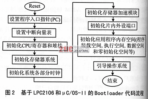 2.3 基于LPC2104和μC/OS-II是多任務(wù)的實時操作系統(tǒng)。針對該款芯片和多任務(wù)實時操作系統(tǒng)的Bootloader程序的流程如圖2所示。
