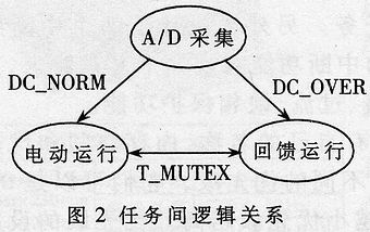 各個任務是通過搶占CPU的使用權(quán)來運行的,它們之間存在一定的邏輯關系,彼此互相聯(lián)系又互相制約。信號量、郵箱、消息隊列等功能為實現(xiàn)任務間通信提供了有力工具,它們的使用方法靈活多變,如用信號量設置事件標志,喚醒任務、用郵箱在任務間傳遞參數(shù)、用消息隊列的循環(huán)尋址功能進行模擬通道的數(shù)據(jù)采集等。本文設計了兩個信號量,在系統(tǒng)運行開始后,任務TASK_AD檢測直流側(cè)電壓的大小。當電壓未超過設定值時,發(fā)出信號DC_NORM喚醒任務Task_NORMAL;當電壓高出設定值時,發(fā)出信號DC_OVER喚醒任務Task_FEBACK。雖然這兩個任務基于不同的控制結(jié)構(gòu),采用不同的算法,但都要使用PWM輸出和SPI通信口,所以在喚醒一個任務的同時必須讓另外一個任務掛起。這里引入了互斥型信號量T_MUTEX實現(xiàn)這個功能。得到T_MUTEX信號的任務將獨自占有共享資源的使用權(quán),兩個任務不會因資源沖突而同時掛起,解決了任務間優(yōu)先級反轉(zhuǎn)問題,避免了系統(tǒng)功能失效。任務間邏輯關系如圖2所示。