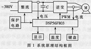 根據(jù)油田生產(chǎn)的要求,系統(tǒng)要實現(xiàn)以下功能:鍵盤輸入、參數(shù)顯示、三相電流采集、直流側(cè)電壓采集、溫度采集、變頻指令輸出以及保護等。系統(tǒng)對電流、電壓、溫度進行周期性采樣,采樣值經(jīng)過數(shù)字信號處理,作為控制器的參數(shù),最后由控制算法得出控制量,經(jīng)PWM和D/A轉(zhuǎn)換器發(fā)送給變頻器,形成反饋閉環(huán)控制。系統(tǒng)運行過程中實時顯示電流、溫度等參數(shù),并可以通過鍵盤對控制器進行參數(shù)在線設定。另外,高溫、過流等保護功能必不可少。系統(tǒng)原理如圖1??刂破鞲鶕?jù)直流側(cè)電容C上電壓的大小來確定以哪一種控制結(jié)構(gòu)運行。當直流側(cè)電壓不超過設定值時,系統(tǒng)以電動狀態(tài)運行。超過設定值時要以回饋制動方式運行,要求兩種工作狀態(tài)要互鎖,切換要準確、及時。