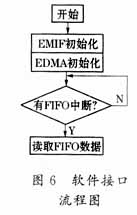 AD6644與C6211 DSK軟件接口程序完成數(shù)據(jù)從異步FIFO向內(nèi)部存儲(chǔ)器的傳輸。當(dāng)主程序發(fā)出數(shù)據(jù)傳輸命令及FIFO向CPU發(fā)出中斷請(qǐng)求時(shí),該程序被調(diào)用。圖6為軟件接口流程圖。