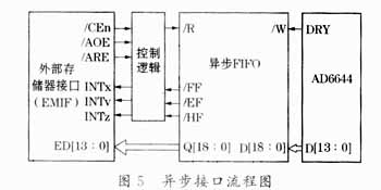 因?yàn)門MS320C6211 DSK與外設(shè)之間沒有專門的高速接口,它只有一個(gè)用于擴(kuò)展外部存儲(chǔ)器的外部存儲(chǔ)器接口(EMIF),所以,只能通過充分利用EMIF的擴(kuò)展功能,在AD6644與EMIF之間建立一個(gè)接口,實(shí)現(xiàn)數(shù)據(jù)的高速傳輸。接口采用異步先進(jìn)先出存儲(chǔ)器(FIFO)形式。這是因?yàn)锳D6644的對(duì)外數(shù)據(jù)輸出和相應(yīng)接口是一種主(Master)的形式,它的輸出控制信號(hào)只有數(shù)據(jù)準(zhǔn)備(Ready)一個(gè),運(yùn)用FIFO可以大大減少接口控制邏輯的復(fù)雜性。另外,F(xiàn)IFO可以向EDMA發(fā)出中斷信號(hào),因而實(shí)現(xiàn)數(shù)據(jù)傳輸觸發(fā)的多樣性。圖5為異步FIFO接口框圖。