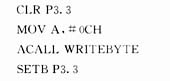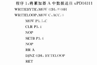 在時(shí)鐘作用下,從低位到高位一位一位地將數(shù)據(jù)寫到uPD16311。又如將顯示存儲(chǔ)區(qū)地址00H清零,命令代碼為#40H,地址代碼為#0C0H,數(shù)據(jù)代碼為#00H,先選通uPD16311,然后將這三個(gè)代碼分別送給累加器A,連續(xù)調(diào)用3次WRITEBYTE即可。