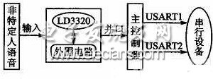 本文的語音識別方案是以嵌入式微處理器為核心,外圍加非特定人語音識別芯片及相關(guān)電路構(gòu)成。語音識別芯片選用ICRoute公司的LD33 20芯片。