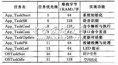 模塊的核心處理單元選用ST公司的基于ARM Cortex-M3內(nèi)核的32位處理器STM32F103C8T6。本模塊以對話管理單元為中心,通過以LD3320芯片為核心的硬件單元實現(xiàn)語音識別功能,采用嵌入式操作系統(tǒng)μC/OS-II來實現(xiàn)統(tǒng)一的任務(wù)調(diào)度和外圍設(shè)備管理。