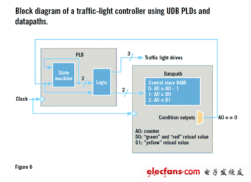 圖6:採用UDB PLD和數(shù)據(jù)通路建構(gòu)的紅綠燈控制器結(jié)構(gòu)圖。