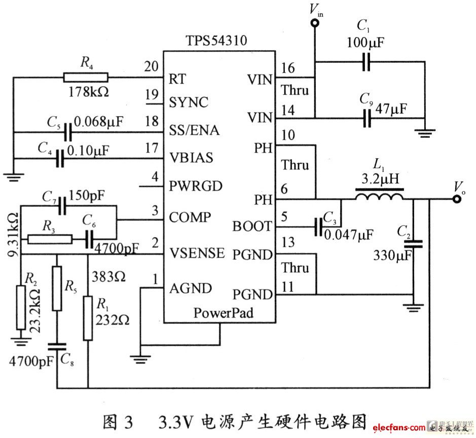 本系統(tǒng)設(shè)計(jì)采用低電壓輸入、大電流輸出的同步PWM降壓式電壓轉(zhuǎn)換器TPS54310實(shí)現(xiàn)電源系統(tǒng)設(shè)計(jì),采用TPS54310只需少量外圍元件,60 mΩ的MOSFET開關(guān)管可保證在持續(xù)3 A的輸出電流