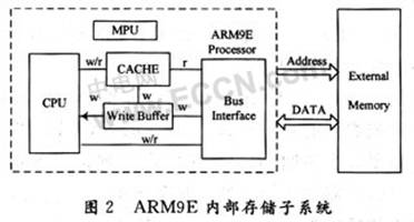 9302 像ARM926EJ 和ARM946E這兩個(gè)最常見(jiàn)的ARM9E處理器中,都帶有一套存儲(chǔ)器子系統(tǒng),以提高系統(tǒng)性能和支持大型操作系統(tǒng)。如圖2所示,一個(gè)存儲(chǔ)器子系統(tǒng)包含一個(gè) MMU(存儲(chǔ)器管理單元)或MPU