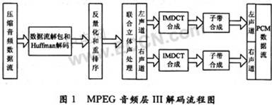 MP3解碼的流程如圖1所示,解碼的主要過(guò)程包括同步處理、解幀頭、解邊帶信息、解比例因子、Huffman解碼、逆量化、頻率線(xiàn)重排序、立體聲處理、混疊重建、改進(jìn)離散余弦逆變換(IMDCT)、頻率倒置處理、子代綜合濾波,最后輸出原始的PCM數(shù)據(jù)。